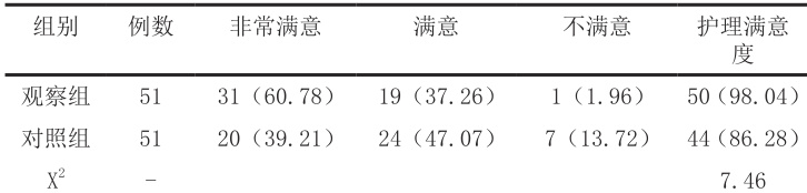 2.1 观察组护理满意度高于对照组,差异明显( P<0.05 ),见表 2