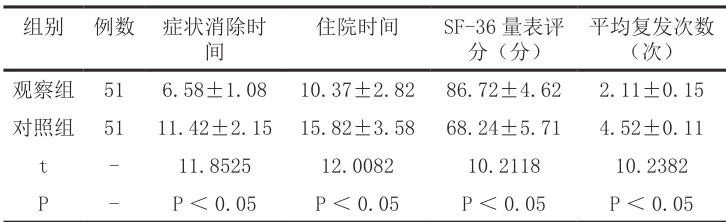 2.2 观察组症状消除时间、住院时间、平均复发次数低于对照组,SF-36 量表评分高于对照组,差异明显( P<0.05 ),见表3。
