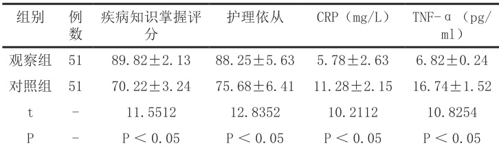 2.3 观察组疾病知识掌握评分、护理依从高于对照组,CRP、TNF- ∝ 指标低于对照组,差异明显( P<0.05 ),见表 4