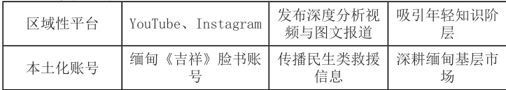 本土化适配策略 :针对缅甸受众偏好 ≫ 图文 + 短视频 + 缅语字幕 ≫ 的接收习惯,» 吉祥 ≫ 脸书账号推出《中国救援队的一天》系列短视频,每段时长控制在30 秒至1 分钟,配合缅语旁白与英文字幕,信息触达率提升3 倍。