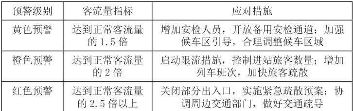 构建大客流安全管理体系,首要任务是升级客流监测设备与优化预警机制。采用高清摄像头、智能传感器及大数据分析系统,可实现对车站客流全方位、实时、精准监测,同时建立科学预警阈值,根据车站承载能力与历史数据,结合不同时段、场景,设置黄、橙、红三级预警。黄色预警(达正常客流1.5 倍)时增派安检人员、开放备用通道;橙色预警(达2 倍)启动限流、增加列车班次;红色预警(达 2.5 倍以上)关闭部分出入口并实施紧急疏散,且通过站内广播、手机APP 等多渠道发布预警,确保信息全面覆盖。