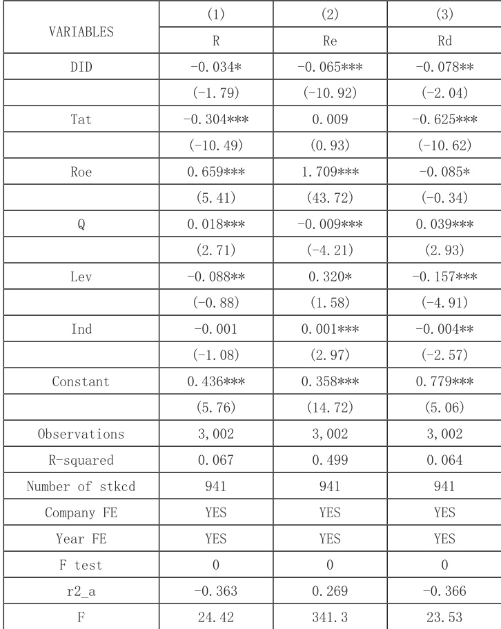 表 3-2 显示了沪港通与资本成本、股权资本成本、债务资本成本的回归结果。结果表明,本论文的主要解释变量 DID 的相关系数都达到了10% 的显著性水平。其中,股权资本成本和债务资本成本显著性分别为 1% 和 5% 。