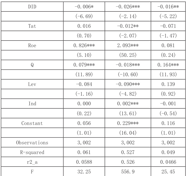 本文原回归结果得到的结果是多维面板固定效应估计得到的,如果只采取简单 OLS 回归,不对固定效应进行控制,得到的结果如表 3-3 中所显示出来的, DID 变量的回归系数仍然可以均在 10% 的显著性水平下是显著的,其余回归系数的结果与本文的结果在总体上比较接近,这就说明了本文的结论在采用不同估计技术时仍然具有稳健性。