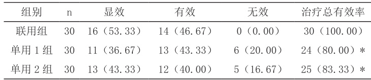 表 1 显示:联用组患者的治疗总有效率高于单用 1 组和单用 2 组(P<0.05 )。