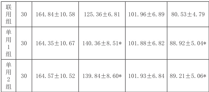 表 2 显示:联用组患者治疗后的收缩压和舒张压水平比单用 1 组、单用2 组更低, P<0.05