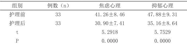 应用 SPSS 21.0 统计软件评估 33 例社区老年体检者资料,计量资料包含社区老年体检者护理前后焦虑心理、抑郁心理状态评分,t 检验计算后呈现为(均数 ± 标准差),其结果 P<0.05 则评估为差异存在。