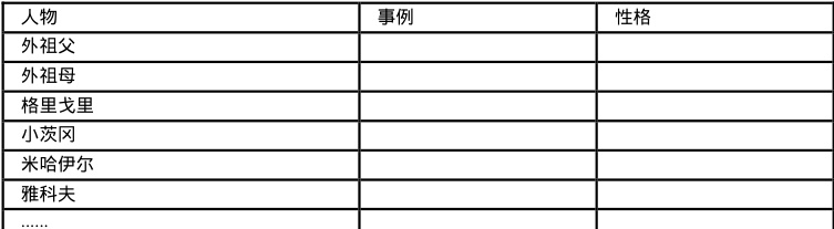 《童年》这本小说中阿廖沙,外祖父,外祖母,格里戈里,小茨冈,舅舅们......这些人物都具有比较鲜明的特点。可以通过设计表格的形式请学生完善相关内容,从而引导学生有计划地读下去。