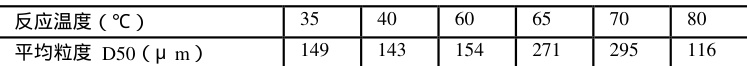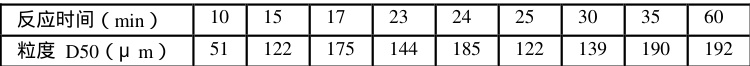 反应时间对石膏 D50 的影响结果见表 2 。反应进行 10 分钟时 D50 仅为 51μm;10~20 分钟内粒度快速增长,24 分钟时达到 185μm ;超过 20 分钟后,D50 呈现波动( 122~192μm ), 35~60 分钟稳定在 190μm 左右。