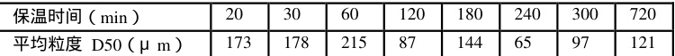 保温时间与石膏 D50 的关系数据见表 3° 。保温 20~30 分钟时,D50 从 173μ m 增至 215μm ;超过 30 分钟后,粒度逐渐下降,720 分钟时降至 121μm