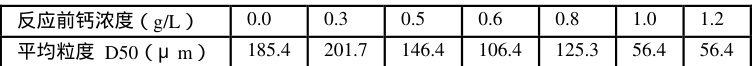 反应前硝酸钠溶液中钙浓度与石膏 D50 的关系见表 4 。钙浓度为 0.0g/L 时,D50为 185.4μm ;随钙浓度升高,粒度逐渐降低,当钙浓度 ≥0.6g/L 时,D50 降至 106.4μm 以下, 1.0~1.2g/L 时稳定在 56.4μm 。