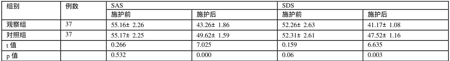 施护前SAS、SDS 量表评分2 组平行比较差异微小 P>0.05 ,施护后与对照组做平行对比SAS、SDS 量表评分均为观察组较低 P<0.05