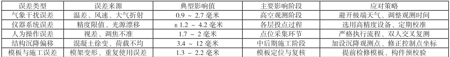 建筑结构在施工过程中因受混凝土徐变、荷载不均或施工节奏不同步等因素影响,容易出现竖向沉降与水平方向的结构偏移。在混凝土强度发展不均时,结构日沉降速率达1.1毫米,累计沉降量在三周内可达12毫米,若未及时修正控制点,将导致高层轴线传递误差超过 8 毫米。大跨度楼板施工后 30 天内的回缩长度可达 5 毫米,造成轴线基准点相对移动,影响相邻层间轴线的延续性。高层建筑中结构热胀冷缩对测量点位也构成持续扰动,30 摄氏度温差引起梁体长度变化为1.6毫米 [4]。上述结构偏移与沉降因素未纳入轴线测量修正系统时,误差将不断累积并扩散至竖向定位体系中,造成最终安装精度偏离设计标准,详见表 1
