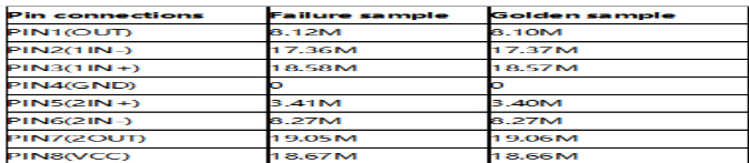 (2) 电压测量法 : 量测电源正常输出时,输出的电压正常为 4.5V,仅在 OCP 过载的情况下,电压出现跳动现象,输出电压不稳定,可初步确认为OCP 电路上面的异常情况。(3) 电阻测量法 : 量测 OCP 电路上面的电阻,电容,二极管和 IC 各引脚阻抗,未发现异常。测量IC3 各引脚阻抗如图1。