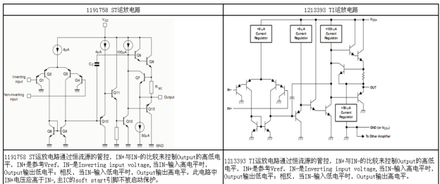 (1) 两款 IC 运放电路对比,输入、输出逻辑一致,无明显差异。ST 运放电路通过恒流源的管控, IN+ 与 IN- 的比较来控制 Output 的高低电平, IN+ 是参考 Vref 引脚,IN- 是 Inverting input voltage 引脚 , 当 IN- 输入高电平时,Output 输入低电平;相反,当 IN- 输入低电平时,Output 输入高电平。此电路中 IN+ 电压应高于 IN-,主 IC 的soft start 引脚不被启动保护。 TI 运放电路通过恒流源的管控, IN+ 与 NI- 的比较来控制Output 的高低电平, IN+ 是参考 Vref 引脚,IN- 是 Inverting input voltage 引脚,当 IN- 输入高电平时,Output 输出低电平;相反,当 IN- 输入低电平时,Output 输出高电平,所以工作原理没有差异。两款IC 电路对比如图2.