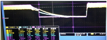(1) 根据 OCP 电路上的各个引脚,需要取 4 根电压探头,分别检测 PIN1,PIN2,PIN3和 VCCP 引脚,将探头放置于个引脚,各引脚波形颜色区分 ,PIN1 绿色、PIN2 黄色、PIN3 淡蓝色、VCCP 紫色;开启不良电源,OCP 启动保护后 IC3 的 PIN2 脚一直处于反转电压,比 PIN3 脚高出 1.5V 左右的电压,输出低电位,主 IC 的 softe start 一直处于低电平,导致 OCP 一直处于保护状态。从电路原理来看,VCCP 的时序必须与 PIN2 的时序保持一致,但是从实际测试出来的波形发现,PIN2 黄色波形一直与 VCCP 紫色波形时序不同步,总是提前跳往高电平处。参考以下波形如图3