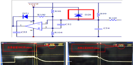 (3) 通过所抓波形发现,关机或 OCP 后 VCCP 电压会急速下降至 0V,TI 的 IC PIN2脚会飘高,比 PIN3 脚电压高出 1.5V 左右,为此在 PIN2 脚与 VCCP 脚上增加钳位二极管 D28 拉低电压,保证第 2 脚比第 3 脚电位低,输出高电平,不触发主 IC 的 Softe start引脚保护。