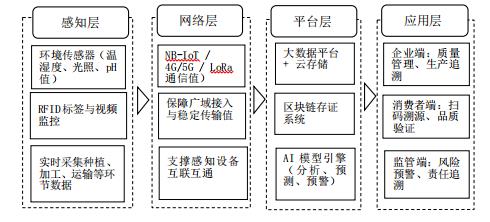 部署各类环境与产品状态传感器(如温湿度、光照、土壤 PH 值传感器)、RFID 电子标签、视频监控设备,实现对种植、采摘、加工、仓储、运输等环节的实时数据采集,是实现全生命周期追溯的基础[1]。