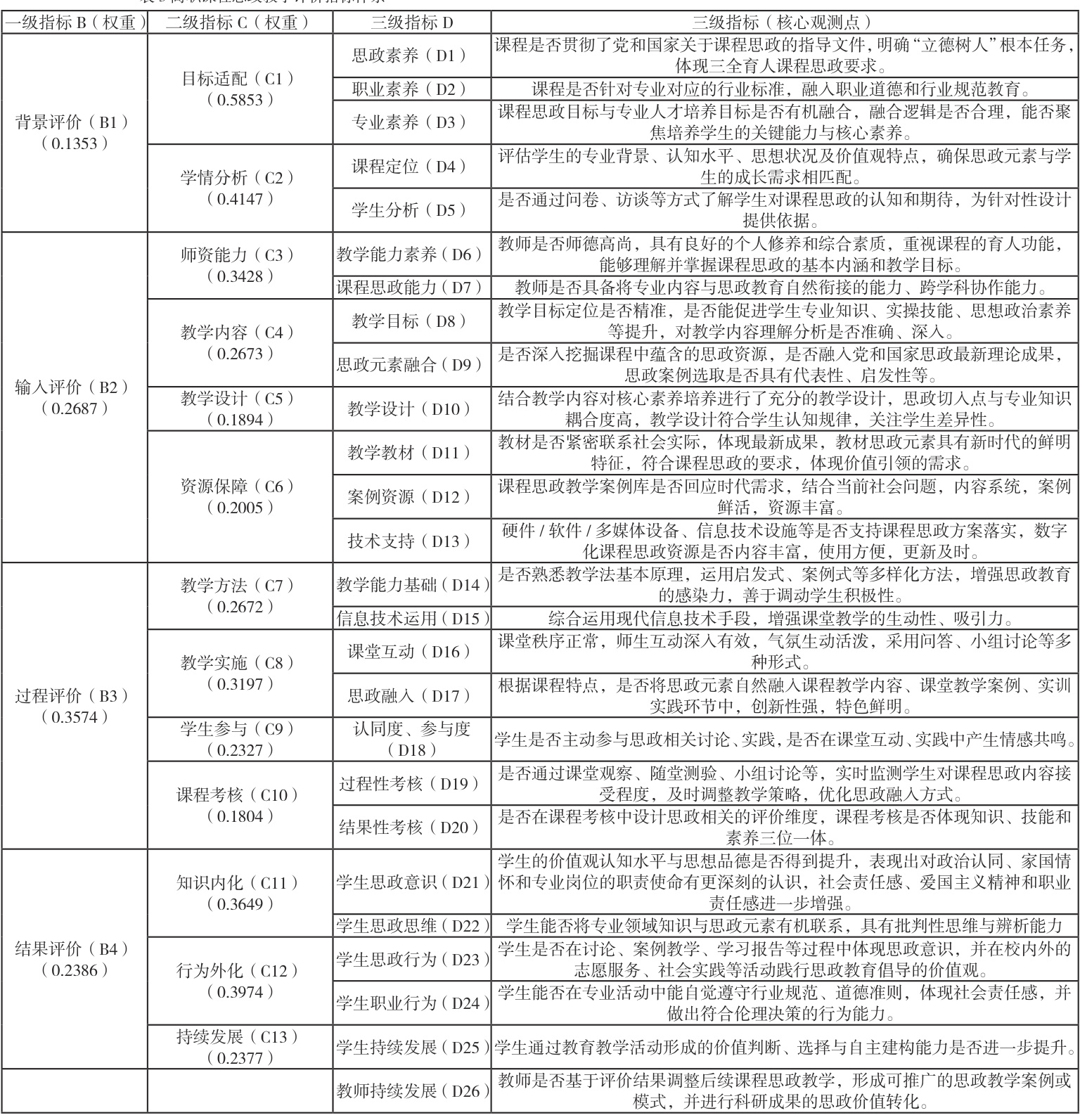 CIPP 评价是由美国教育评价学家 (D.L.Stufflebeam) 提出一种评价模型,由背景评价 (Context Bvaluation)、输入评价 (Imput Evaluation)、过程评价 (ProcessEvaluation)、成果评价 (Product Evaluation) 4 部分组成 [7]。国内学者将 CIPP 模型应用于不同课程的教学评价。佟瑞鹏,王乐瑶,王露露等(2022)[8] 基于CIPP 模型构建安全学科课程思政评价,包括背景基础、资源配置、实施过程、成果效益 4 个一级指标 , 学科定位等 11 个二级指标 , 落实立德树人等 30 个三级指标 , 并计算各级指标权重。胥炜,廖开兰(2024)[9] 基于 CIPP 模式从 4个方面构建高校课程思政评价体系。孙向前,陈美玲等(2025)[10] 基于 CIPP模型的123 所高职院校实证分析,构建高职院校专业课课程思政建设成效评价体系。