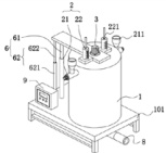 1. 筒体 101. 底座 2. 进料设备 21. 进料螺旋输送机 211. 进料料斗进料调整组件 221. 驱动件 3. 搅拌设备 6. 升降设备 61. 升降组件导向组件 621. 导向管 622. 导向杆 8. 出料设备 9. 控制器