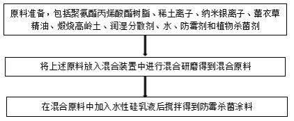 原料主要由聚氨酯丙烯酸酯树脂、稀土离子、纳米银离子、薰衣草精油、煅烧高岭土、润湿分散剂、水、防霉剂和植物杀菌剂等物质组成;原料放入混合装置中进行混合研磨得到混合原料;在混合原料中加入水性硅乳液后搅拌均匀,得到防霉杀菌涂料。曲霉菌的防霉杀菌涂料制备工艺流程如图2。