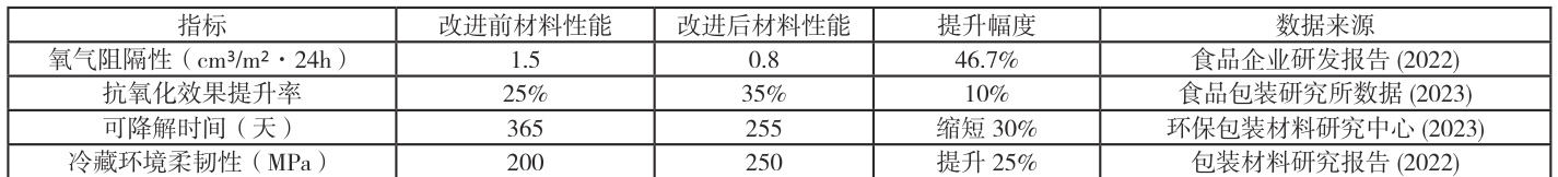 表 1 展示了该新型材料在应用前后的性能对比,通过对氧气阻隔性、抗氧化效果、降解时间和冷藏柔韧性等指标的优化,材料的综合性能得到了显著提升。