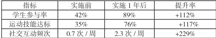 从上表的数据可以看出,经过一年的实践应用,该 4 名特需学生在学生参与率、运动技能达标以及社交互动频次这三个核心指标上均取得了显著的提升。学生参与率从 42% 大幅提升至 89% ,意味着更多的特殊需求学生积极参与到了体育教育活动中,体验到了体育的魅力和乐趣;运动技能达标率从 35% 跃升至 76% ,反映出学生在体育技能方面取得了长足的进步,体育教学质量得到了有效提升;社交互动频次从每周0.7次增加至2.3次,表明学生在体育活动中的人际交往能力显著增强,更好地融入了校园生活。这些数据充分证明了所构建的社会支持系统在提升特殊需求学生体育教育质量方面的显著成效。