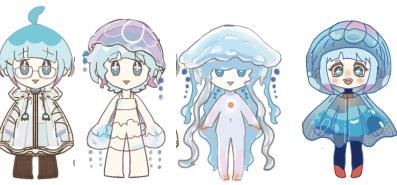 第一版,基于科普动画的大众认知,首版角色设定为科研人员形象,以科研人员为原型进行尝试,采用带透明质感的雨衣呼应水母的半透明特征,发型设计为渐变色水母头,模拟水母伞体与触手的层次感。但过度强调科研人员的职业属性,如标准眼镜框、白大褂元素等,导致水母特征被弱化,角色与桃花水母的关联性不够直观,未能突出科普核心对象。