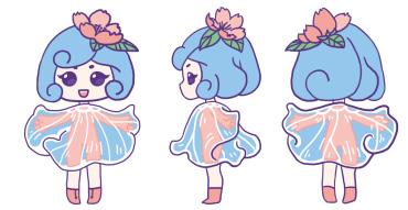 针对第四版的信息过载问题,第五版以减法设计为原则,把桃花水母拆成桃花与水母两个名词,通过视觉符号强化认知。保留雨衣的透明基底与水母轮廓,但弱化繁复花纹,仅通过局部水波纹点缀强化水元素;头部取消冗余装饰,以简约的蓝色短发搭配桃花头饰,平衡人形与水母的视觉比重(如图2.2 所示)。