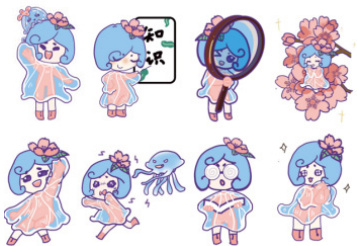 《桃花水母》的视觉风格以具象化与辨识度为基础原则,保留桃花水母的核心生物特征,如半透明伞体、细长触手等,确保观众能通过动画准确认知其形态。在此基础上采用拟人化加 Q 版化的艺术处理,如将伞体设计为女孩的裙摆,既强化角色的亲和力,又暗合生物特征。作品通过手绘完成扁平化风格造型,添加描边使角色看起来更加醒目,也为后续的上色工作带来许多便利,平涂色块使画面看起来清新自然。