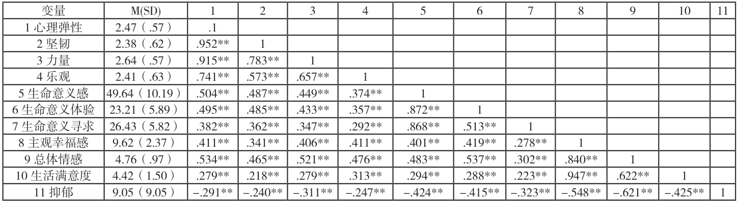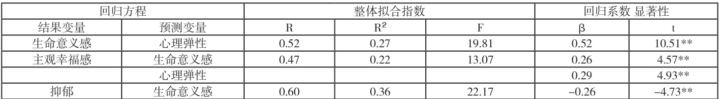 控制了相关人口学变量之后,相关分析显示 ( 见表 1),各变量总分与各维度之间显著相关,心理弹性与生命意义感、主观幸福感存在显著正相关,生命意义感与主观幸福感存在显著正相关,抑郁与心理弹性、生命意义感。主观幸福感均存在显著负相关。
