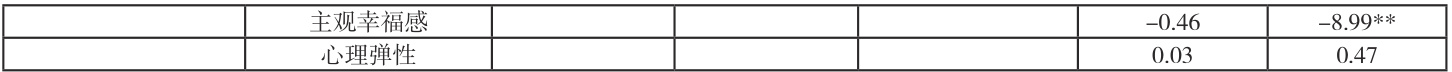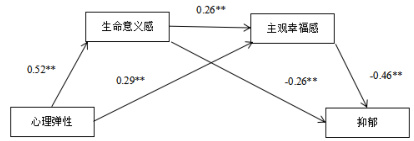 使用 Hayes 编制的 SPSS 宏程序 process,控制了相关人口学变量之后,检验生命意义感与主观幸福感在心理弹性和抑郁关系之间的中介效应。结果如表 2 所示,心理弹性能够显著正向预测生命意义感( β=0.52 , p<0.01 ,也可以显著正向预测主观幸福感( β=0.29 ,p<0.01⟩ ,但是心理弹性对抑郁的直接效应不显著 ( β=0.26 , Δp>Δ 0.01);生命意义感可以显著正向预测主观幸福感( β=0.26,p<0.01) ,可以显著负向预测抑郁 ( β=-0.26 , p<0.01 )。主观幸福感能够显著负向预测抑郁( β=-4.56 , p<0.01 )。