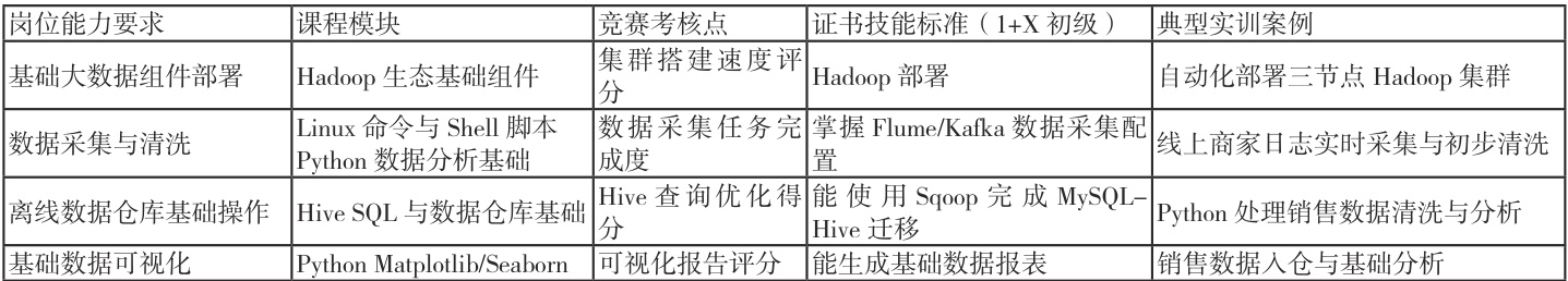 大数据技术与应用专业的主要就业岗有位大数据平台运维工程师、大数据应用开发(Python)等。选取就业岗位大数据应用开发(Python)、权威比赛“全国大学生大数据分析技术技能大赛”和职业资格证书 1+X 大数据应用开发 (Python 初级 )。根据证书等级、岗位能力、比赛内容将教学内容拆解为模块化课程(如表 1),每个模块共同构成课程体系。