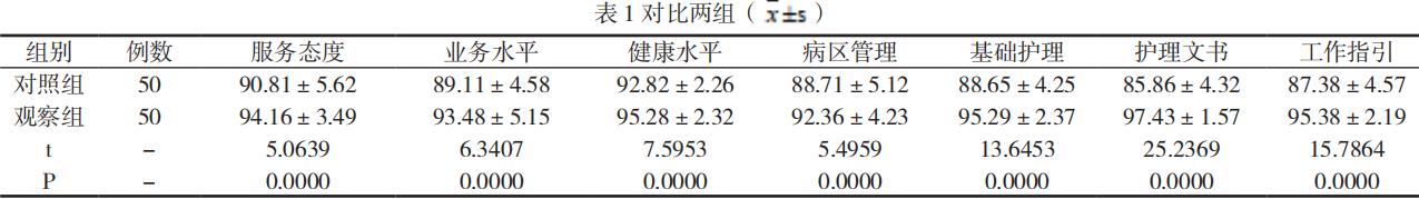 如表1 所示:观察组护理质量评分相对更高,结果比较P < 0.05。