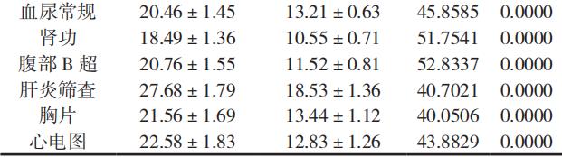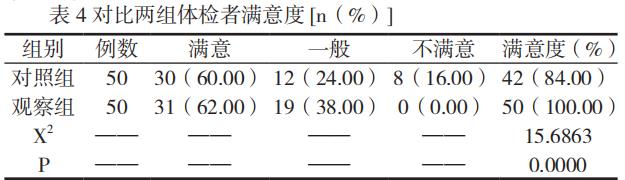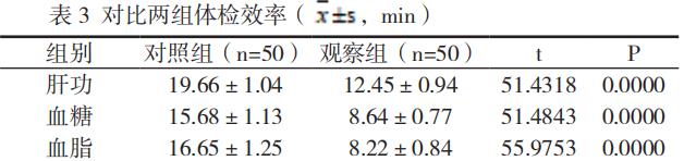 如表 3 所示:观察组检查用时更短,体检的效率更高,结果比较 P < 0.05。