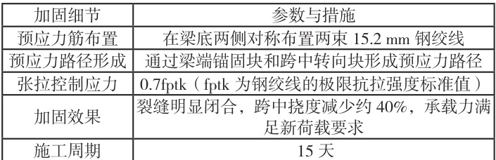 体外预应力加固是将预应力筋布置在构件的外部,通过转向块和锚固装置对预应力筋施加预应力的一种技术。该方法施工便捷,对原构件无损伤,便于后期的检测与维护,广泛应用于大跨度梁、桥梁及工业厂房的加固工程。然而,体外预应力加固对建筑外观有一定影响,且在使用过程中需特别注意预应力筋的防腐与防火措施,以确保加固效果持久可靠。