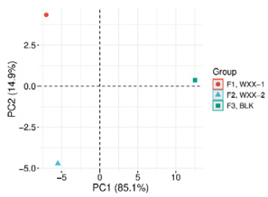 图 1 是片仔癀提取物 LC-MS 筛选数据的主成分分析(PCA)二维得分图,通过主成分维度降维,直观表现了样品(F1,WXX-1;F2,WXX-2)与空白对照组(F3,BLK)的成分差异,以及包裹前后的质量一致性。从坐标轴分布可见:F1、F2 的散点集中在PC1 轴的“-5 至-8”区间,而 F3 的散点显著偏离至 PC1 轴的“12”附近,且在 PC2 轴上也无重叠,组间差异明显。该差异证明片仔癀提取物样品(F1、F2)中存在大量空白对照组(F3)不含的化合物——这些化合物的峰面积差异主导了 PC1 的 85.1% 变异,说明检测到的信号并非来自仪器背景等干扰,而是提取物本身的专属成分,为后续有效成分定量排除了“假阳性”干扰。此外 F1 与 F2 的散点在 PC1 轴的高度聚集说明包裹前后成分组成与含量相似,表明片仔癀提取物在生产过程中稳定性良好。同时PC2 轴的偏离又能够区分包裹前后的样品差异。