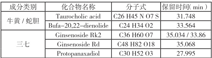 结合片仔癀四种核心成分(牛黄、麝香、三七、蛇胆)的典型化学成分,对筛选出的化合物进行匹配,其对应的化合物如下: