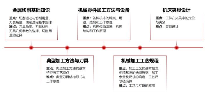 整体来看,这五大模块构成了“原理—方法—设备—工艺—夹具”的完整链条,既保证了知识体系的逻辑性,又体现了课程从理论学习到工程应用的能力培养目标。