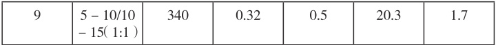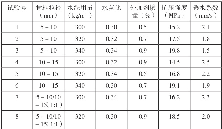 根据极差分析结果,综合考虑抗压强度和透水系数的要求,确定最优配合比为:骨料采用 5-10mm 和 10-15mm 碎石按 1:1 混合,水泥用量为 340kg/ m3 ,水灰比为 0.32,外加剂掺量为 0.5% 。
