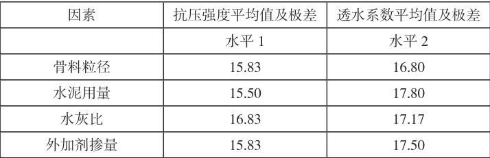 从极差分析结果可以看出,对于抗压强度,各因素的影响主次顺序为:骨料粒径 > 外加剂掺量 > 水泥用量 > 水灰比;对于透水系数,各因素的影响主次顺序为:骨料粒径 > 水泥用量 > 外加剂掺量 > 水灰比。