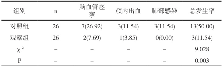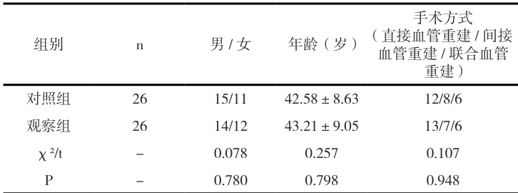 随机抽取2023 年3 月至2024 年3 月间我院治疗的52 例烟雾病患者,分为对照组和观察组,两组患者资料比较 (P>0.05) ,具有可比性,见表 1。
