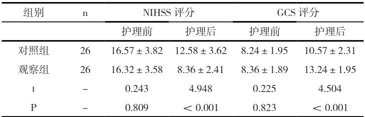 理后观察组NIHSS、GCS 评分均优于对照组( P<0.05 )。见表