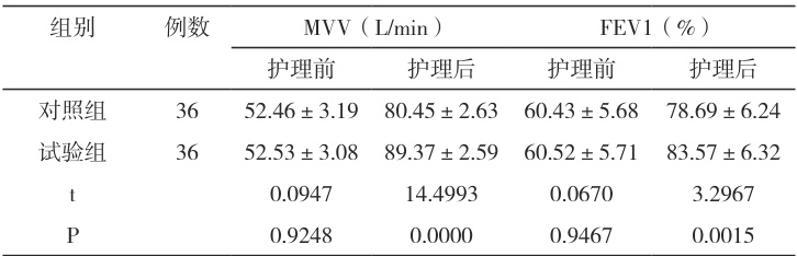 对比两组肺部功能,在护理前,MVV、FEV1 无明显差异,不存在统计学意义( P>0.05 ),在护理后,试验组的 MVV、FEV1 更高,数据之间差异,具有统计学意义( P<0.05 ),见表 3AA
