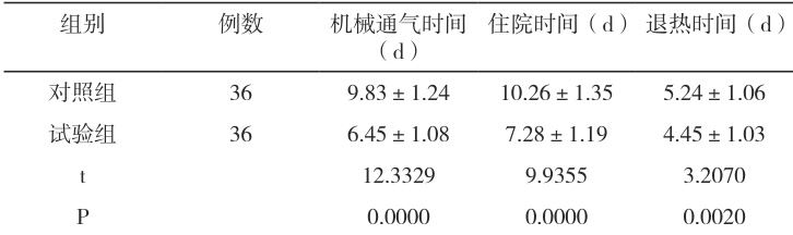 对比两组临床效果,试验组的机械通气、住院,以及退热时间均较短,数据之间差异,具有统计学意义( P<0.05 ),见表 1
