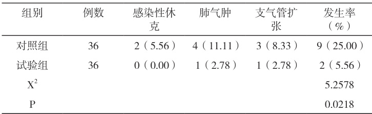 对比两组并发症发生率,试验组的发生率更低,数据之间差异,具有统计学意义( P<0.05 ),见表 2 。