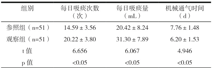 观察组 ICU 重症颅脑损伤患者的每日吸痰次数与吸痰量均高于参照组,且机械通气时间更短,差异显著( P<0.05 ),具体数据参见表1。