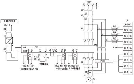低压电动机控制回路可分为工频运行和变频运行两种运行方式,其主回路、控制回路电气原理图如图 1、2 所示。变频运行回路主要由交流接触器 KM1、交流接触器KM2、变频器、时间继电器KT1、时间继电器KT2 等电气元件组成。工频运行回路主要由交流接触器 KM3、电流互感器,电动机微机保护监控装置等电气元件组成。