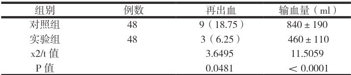 实验组患者再出血率明显低于对照组,输血量少于对照组( P<0.05 )。见表2。