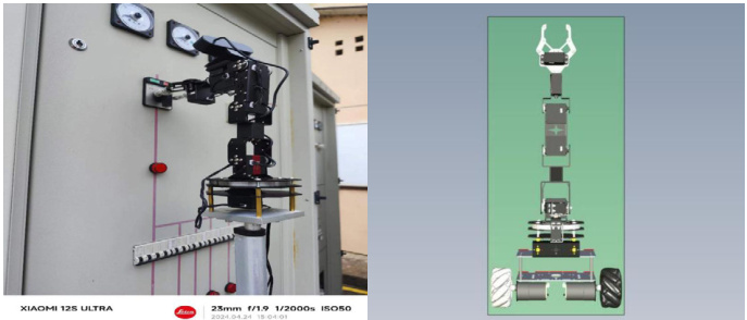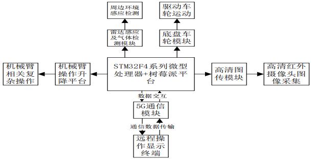牵引无人所远程应急操作机器人基于基站式无线蜂窝网络云透传局域网技术,利用ARM 平台下的嵌入式STM32 下F4 系列单片机和树莓派平台为主控中心,采用 ROS 开源操作系统,以实现远程图传监控并操作机械臂进行无人所( 分区所、AT 所、开闭所 ) 的远距离下的应急操作。它的技术设计方案包括软件方案和硬件方案;软件方案基于 C 语言编程,硬件方案包括微处理器平台、电源供电模块、机械臂操作模块、底盘车轮驱动模块、红外视觉处理图传模块、自动升降模块、5G 通信模块、气体温度检测模块、雷达感应模块。同时还包括机器人机械设计部分。