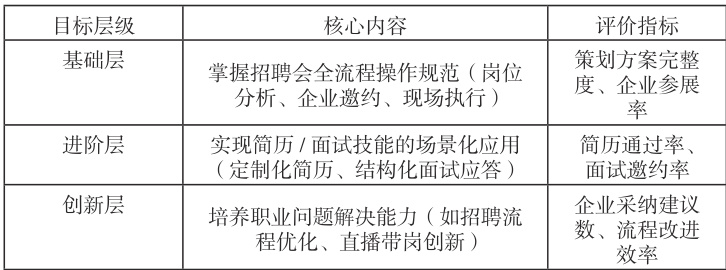 构建“三阶能力进阶”体系,围绕专科人才培养目标,将招聘会实践课定位“课程知识转化器”,设定三级目标: